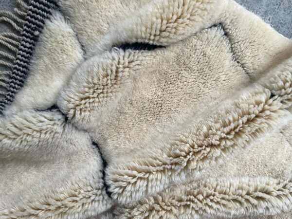 Die Kunsthandwerkerin beschafft sich ihre geschmeidige Schurwolle in den Dörfern des Mittleren Atlasgebirges. Das Produkt stammt von einer in der Region heimischen Schafsgattung. Die rohe Wolle wird mit Hilfe von Seifenkraut im Fluss gewaschen bevor sie, nach alter Berbertradition eine ganze Nacht lang unter dem Sternenhimmel ausgelegt wird, um “den bösen Blick” abzuwenden.