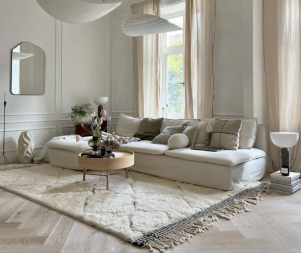 Unglaublich weich, naturrein und herrlich zeitlos, das ist der Beni Mrirt Diamonds Berber Teppich aus dem Herzen des Mittleren Atlas Gebirge in Marokko. Die außergewöhnlichen Berber Teppiche aus reiner Wolle (Schurwolle) sind nach dem Berberstamm der “Beni Ourain” benannt, die ihre Muster und Eigenschaften prägten. Meist finden sich einfache, bei alten Teppichen auch komplexere, geometrische Muster. Die Berberteppiche sind weltweit bekannt und seit der Midcentury Ära ein echter Designklassiker. Ein Revival erhielt der Berber Teppich als ihn Interiorliebhaber des skandinvischen Wohnstils wieder für sich entdeckten.